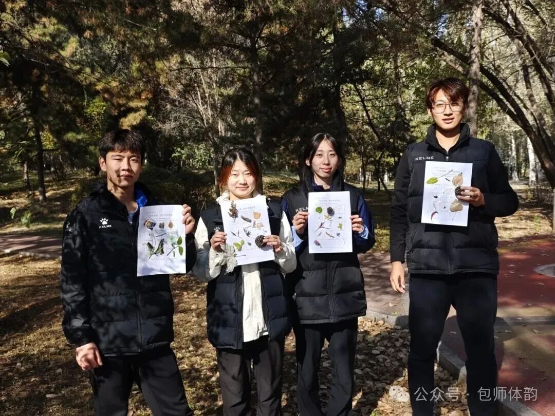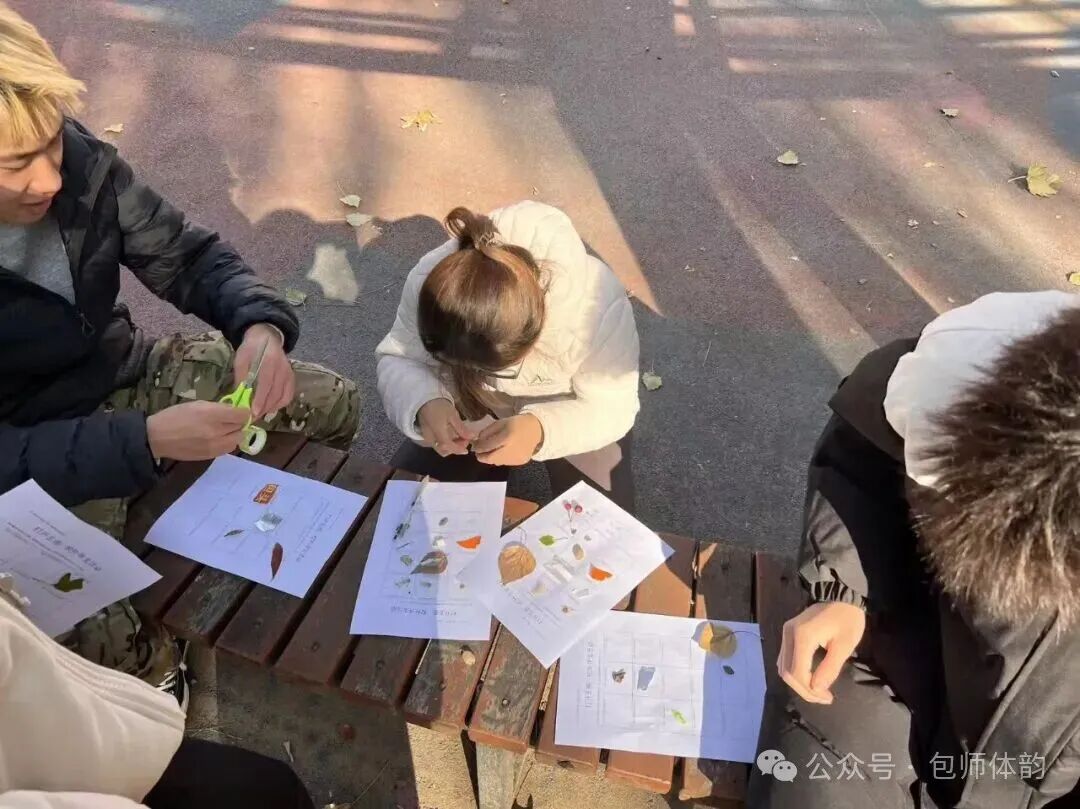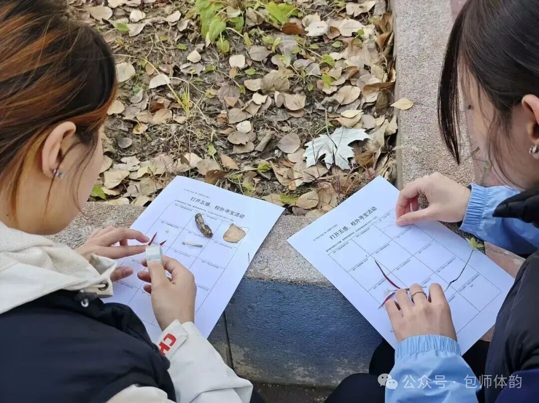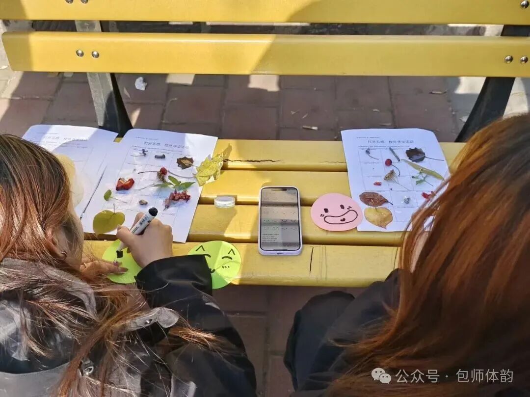 首先进行的是“打开五感,感受美好”户外寻宝游戏。同学们以小组为单位,调动视觉、听觉、嗅觉等多种感官,沉浸式探索自然之美。在爱护环境的前提下,通过收集实物、撰写文字、绘制图画等方式定格所见之美,记录自然中的小确幸。在与自然的对话中,焦虑与疲惫被悄然化解,笑声与创意交织成一幅生动的青春画卷。