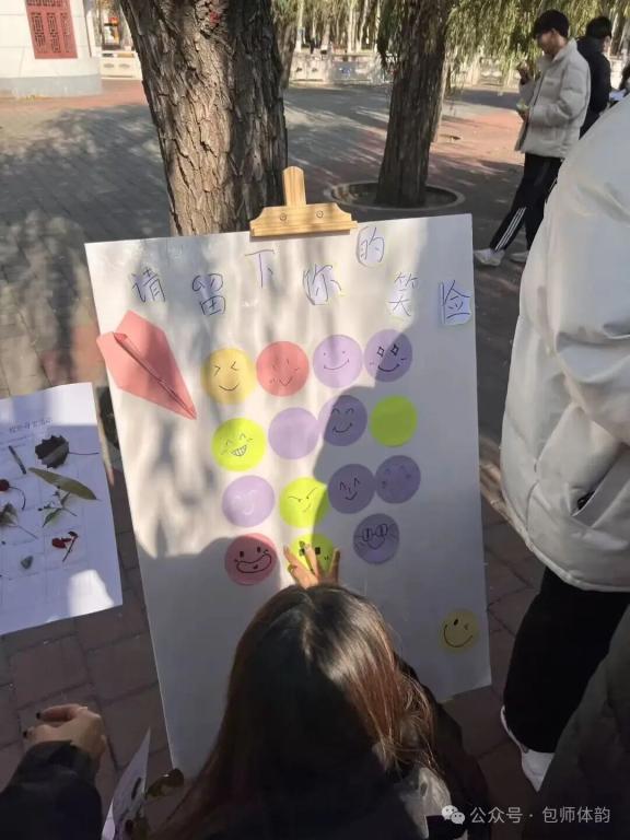 在“绘制笑脸墙,传心灵暖意”环节,学生们将青春的笑容定格在圆形便签纸上,一张张风格各异的笑脸陆续贴满展板。明媚的笑颜不仅点亮了现场氛围,也凝聚了集体的温度与归属感,传递出积极向上的情绪力量。