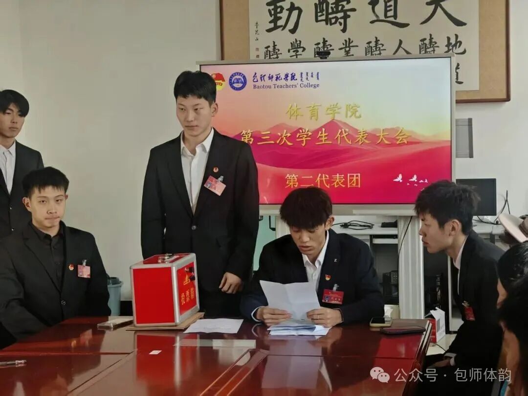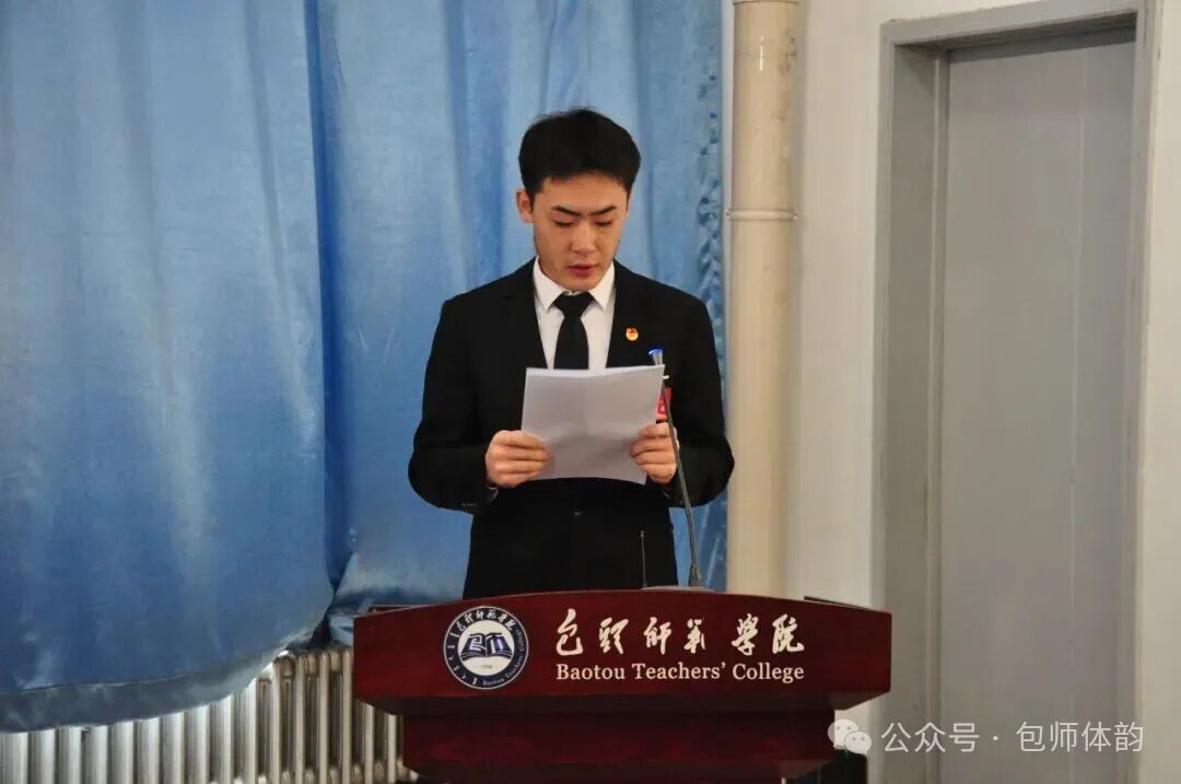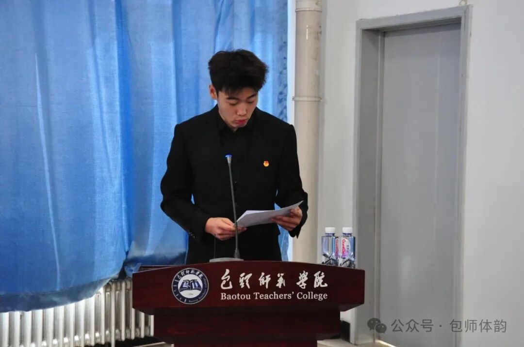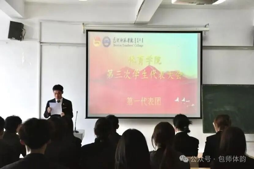 11月29日,包头师范学院体育学院第三次学生代表大会在体育馆五楼会议室举行。院党总支书记王骞、副书记郝宇、学工办负责人宋蕾、团总支负责人王希月、兼职辅导员郭冉昊 、校学生会执行主席康春苗出席开幕式,43名学生代表大会,卢煊担任大会主持人。