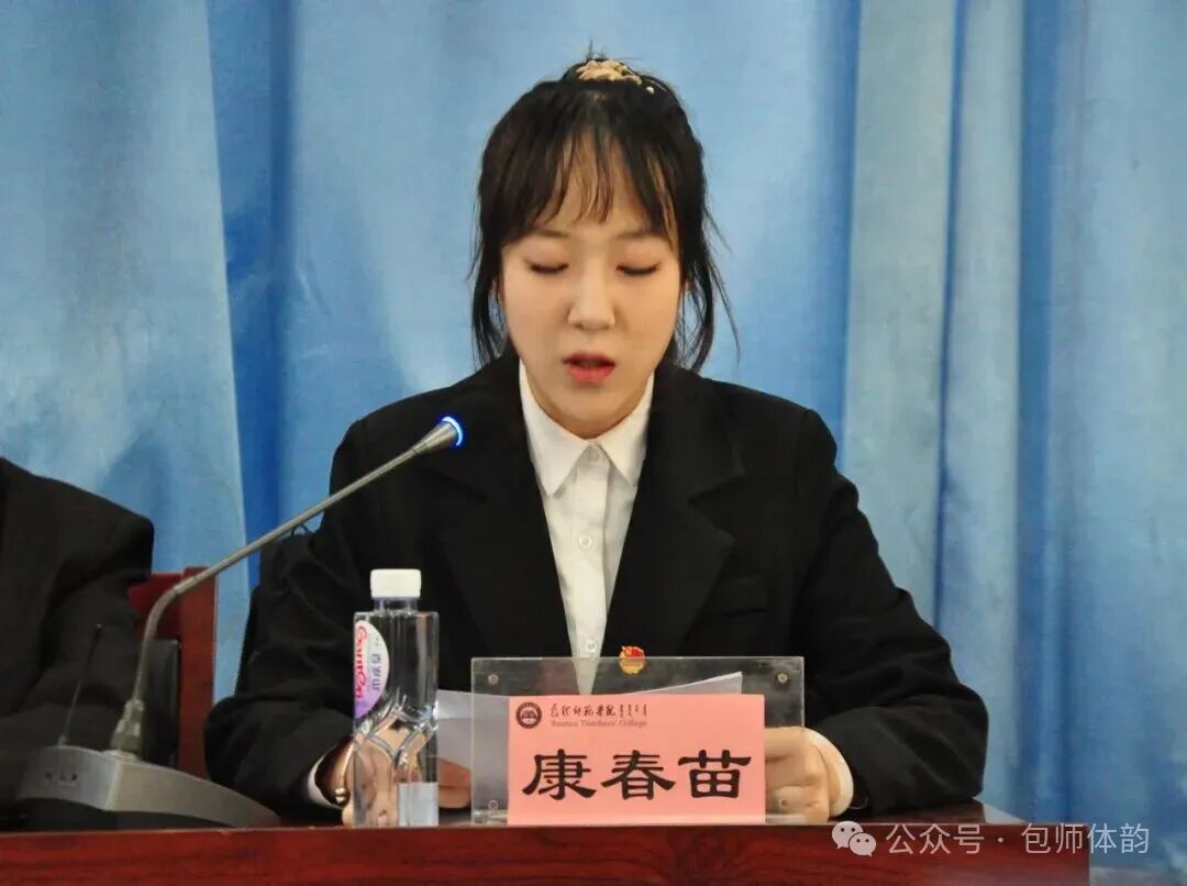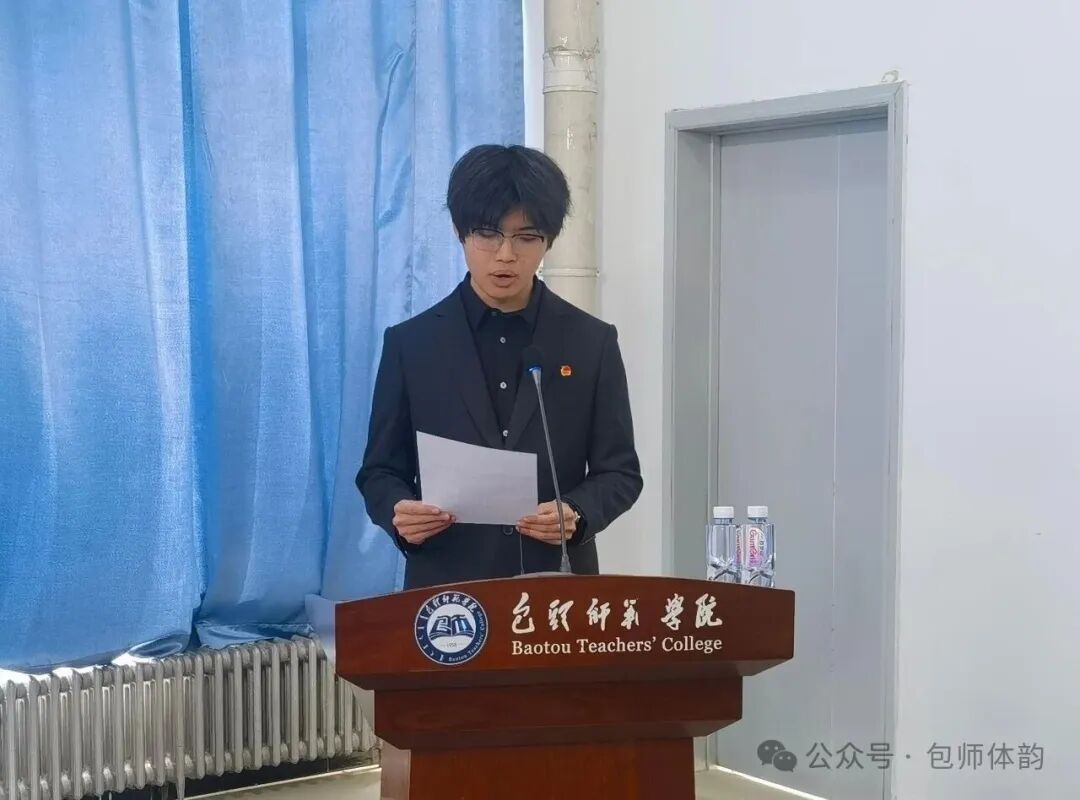 紧接着,康春苗同学代表校学生会祝贺大会召开。她称,多年来体育学院以“强体魄、铸精神”为初心,在人才培养和文化建设上成果显著,培育众多优秀学子,为学校发展贡献力量。校学生会与体育学院学生会将继续携手共进,以青春之朝气、奋进之姿态,共同为学校的高质量发展添砖加瓦,为中华民族的伟大复兴注入青春力量。