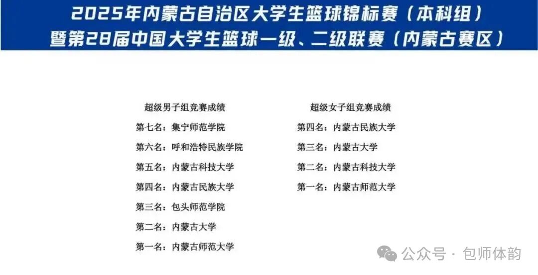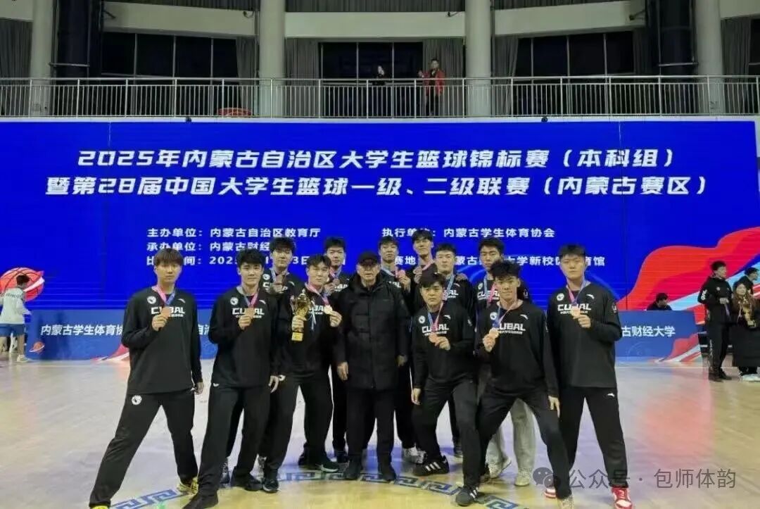 在刚刚落幕的2025年内蒙古自治区大学生篮球锦标赛(本科组)暨第28届中国大学生篮球一级、二级联赛(内蒙古赛区)比赛中,我校男子篮球队取得历史性突破,勇夺本科超级组季军,创下我校在该项赛事中的最佳战绩。本届赛事汇聚了全区多所高校的顶尖队伍,竞争激烈。在校领导与体育学院的大力支持下,由杨小鹏教练率领的我校男篮团结一心、奋勇拼搏,凭借稳定的技术发挥、顽强的比赛作风与合理的战术布置,连克强敌,最终荣获第三名,展现了我校学生良好的精神风貌与体育素养。