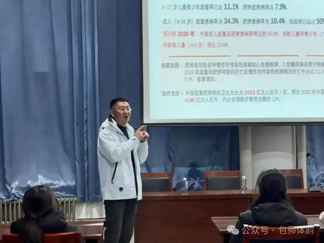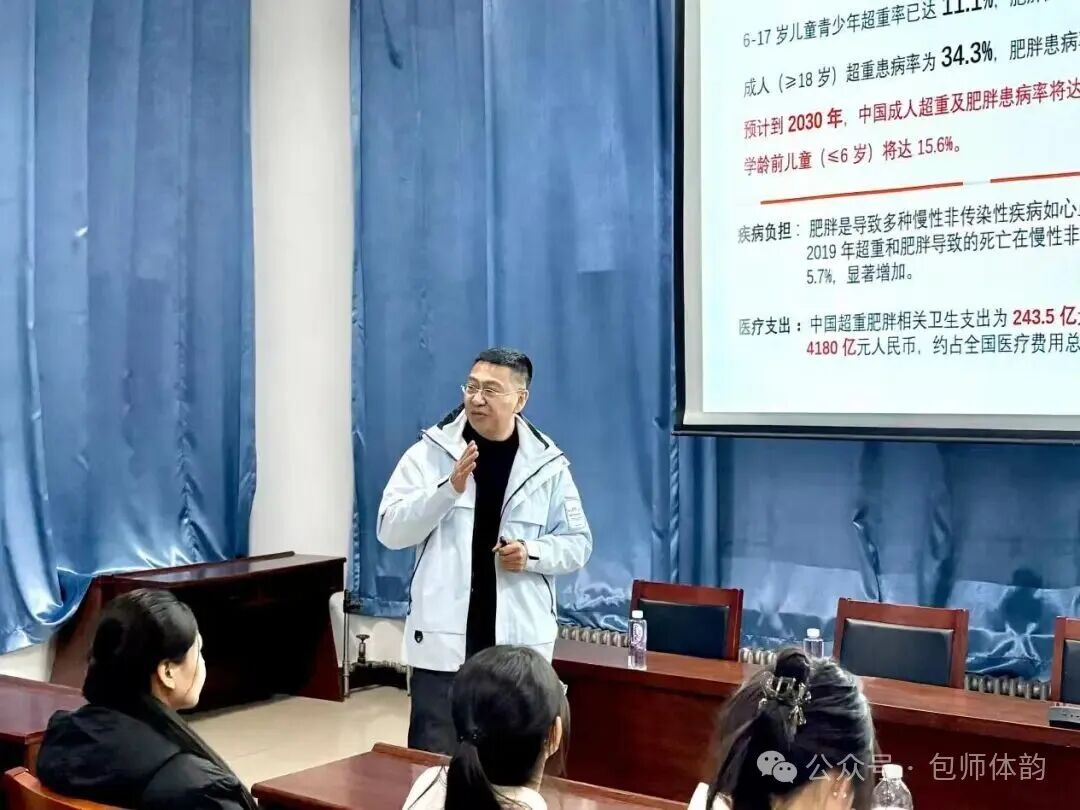 活动伊始,体育学院人文教研室主任刘哲老师带来一场题为“生活哲学——运动”的健康知识讲座。他以亲切生动的讲述,深入浅出地剖析体重管理与青春活力之间的科学联系,系统梳理前期系列讲座的核心内容,引导同学们在思考中领悟健康生活的真谛,现场反响热烈。