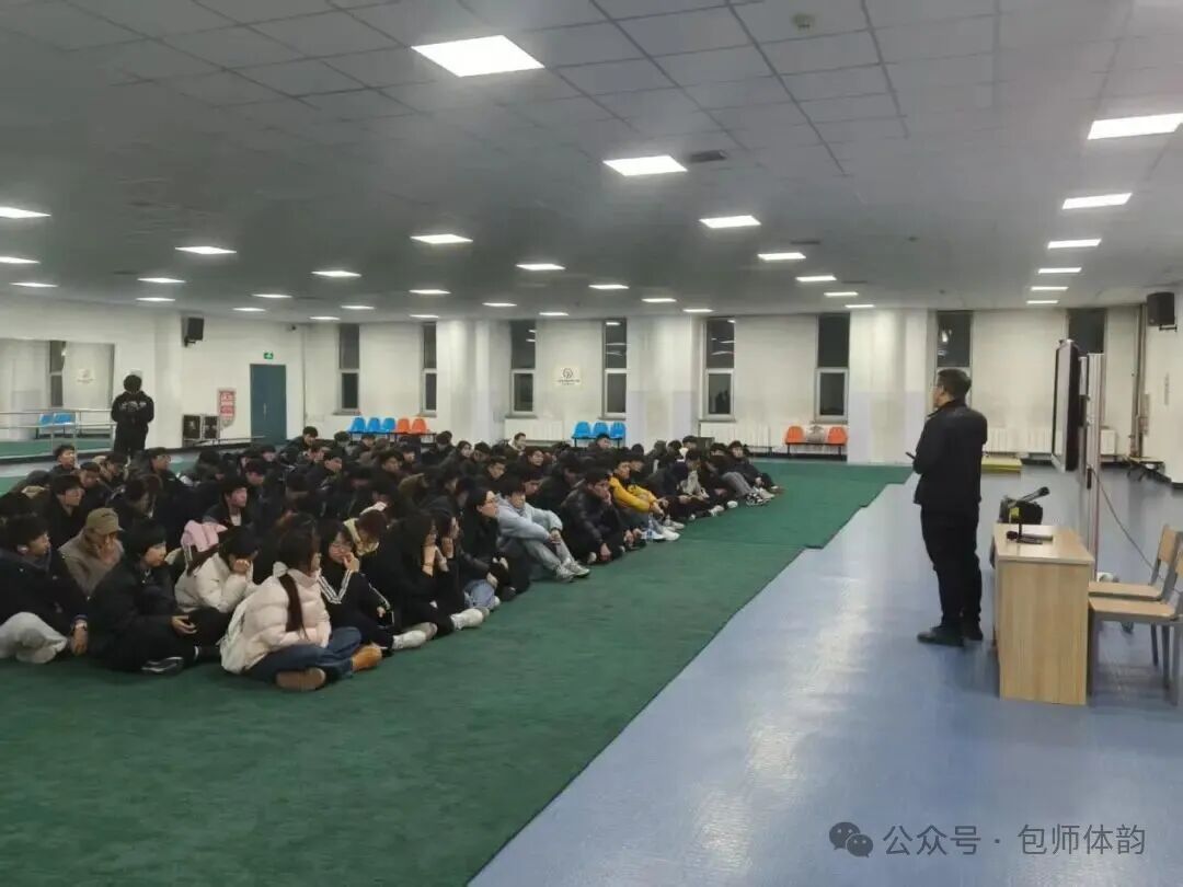 为深入贯彻新时代征兵工作要求,激发青年学子参军报国热情,12月11日晚,包头师范学院大学生征兵入伍宣讲活动在体育馆武术馆顺利举行。本次活动由体育学院承办,学生工作部国防教育科科长陈东胜老师担任主讲,体育学院与信息科技与技术学院部分学生共同参与。