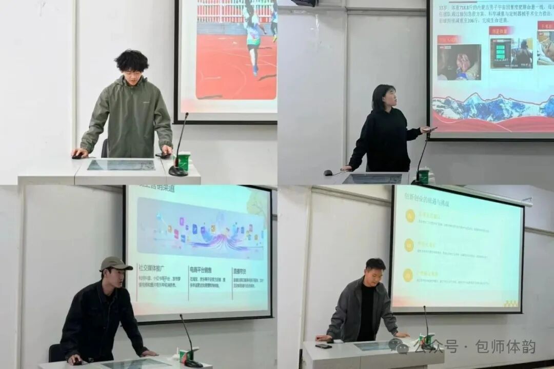 路演环节中,参赛选手通过PPT展示与现场答辩,系统展示了各自项目的创新亮点、可行性分析及发展规划。项目聚焦体育科技融合、运动健康管理、体育产业服务等前沿领域,涵盖校园体育健身共享服务平台、地方特色体育文旅融合项目、体育线上课程开发以及废旧体育器材回收利用等构想,充分展现了体育学子的专业素养、敏锐的市场洞察力与创新精神。