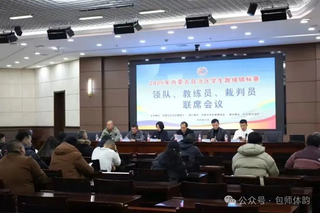 当马头琴的韵律与跳绳的节拍相遇,当草原儿女的豪情与青春的活力碰撞,由自治区教育厅主办、自治区学生体育协会执行、包头师范学院承办的2025年内蒙古自治区学生跳绳锦标赛圆满落下帷幕。赛前联席会在包头师范学院图书馆一楼会议室召开,内蒙古自治区教育厅体育卫生艺术与劳动教育处副处长李俊杰,内蒙古学生体育协会副会长曲伟东,包头师范学院党委委员、副校长马占飞,包头师范学院体育学院院长尚岩,技术代表李强,裁判长杨虎出席联席会。会议由包头师范学院体育学院院长尚岩主持,来自全区各盟市的跳绳小将们齐聚一堂,以绳为翼,在赛场上划出属于青春的昂扬弧线,书写了一场速度与技巧并存、团结与拼搏交织的体育盛会。